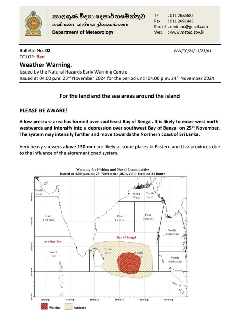 Naval and fishing communities are warned not to venture to the sea areas off the coasts extending from Manna to Hambantota via Kankasanthurai, Trincomalee, Batticaloa and Pottuvil, from 24th November, until further notice.
