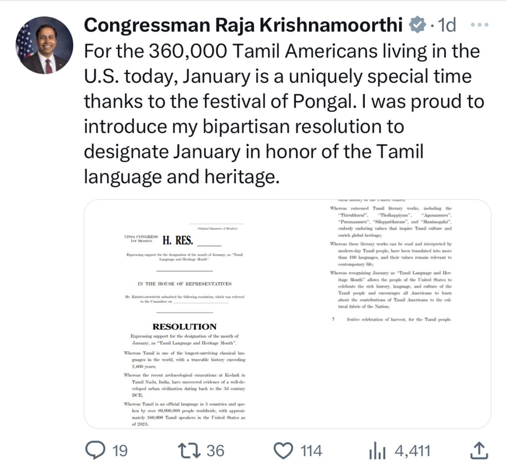 In a landmark recognition of Tamil heritage and culture, Congressman Raja Krishnamoorthi (D-IL) has introduced a bipartisan resolution to designate January as “Tamil Language and Heritage Month”.