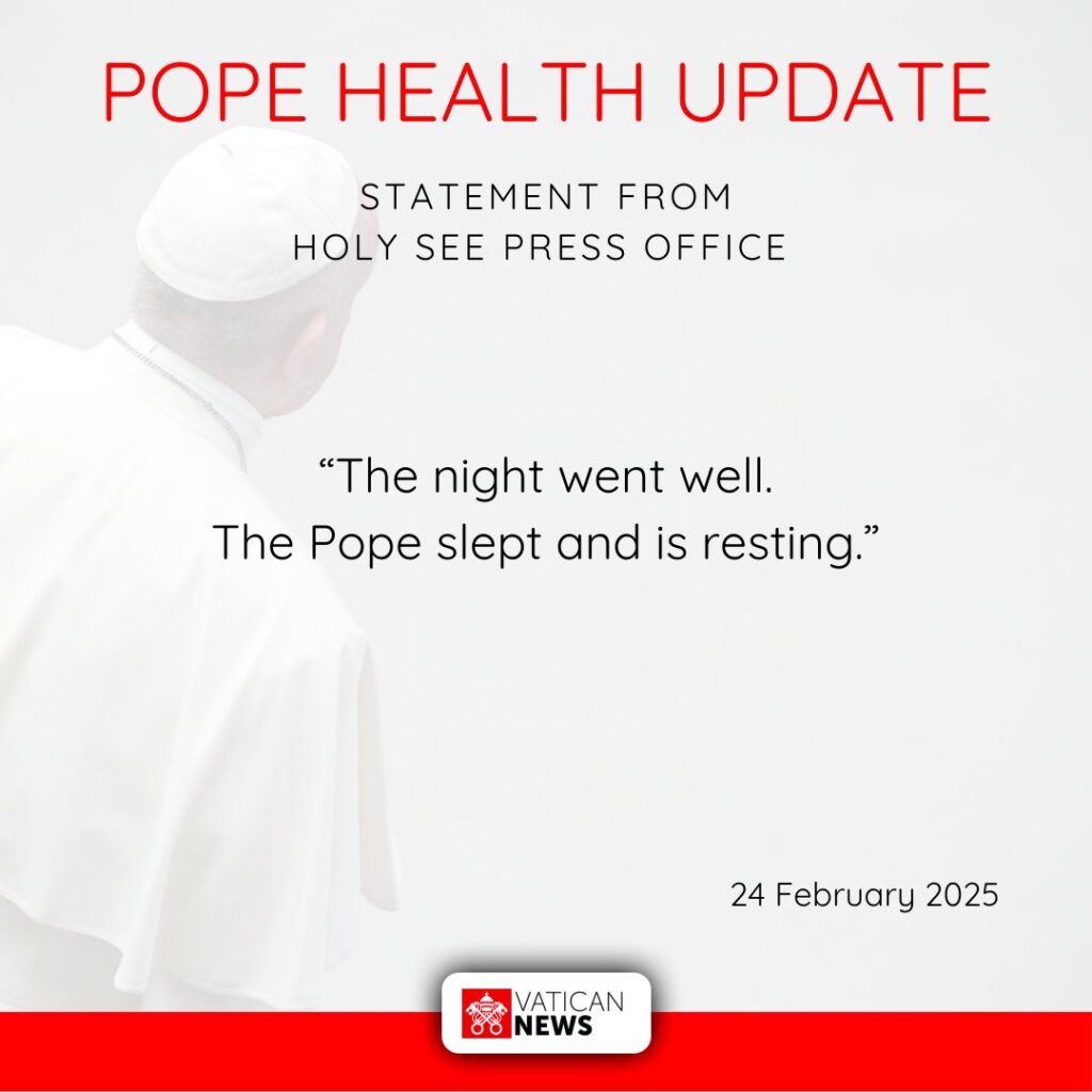 “It was a good night, the pope slept and is resting,” the Vatican said in a one-sentence update on Monday morning that did not provide further information.