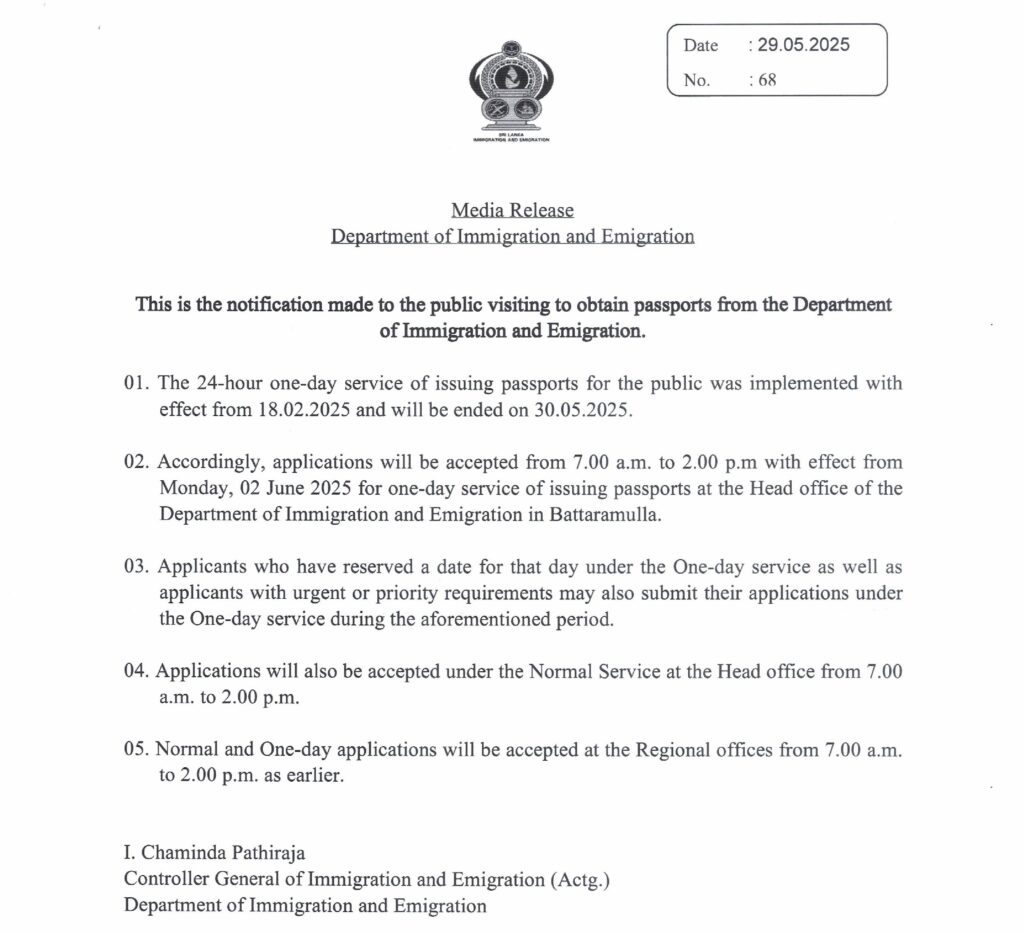 Starting June 2, passport applications under the one-day service will be accepted at the Department’s Head Office in Battaramulla from 7:00 am to 2:00 pm. This applies to both applicants who have pre-booked appointments and those with urgent or priority needs.