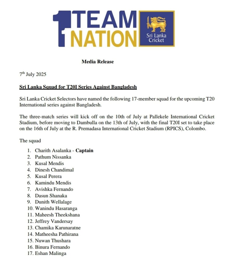 Sri Lanka Cricket Selectors have named the following 17-member squad for the upcoming T20 International series against Bangladesh.
