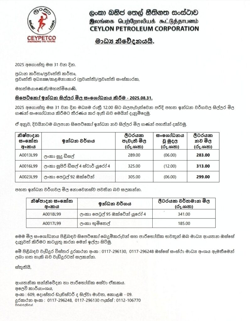 The Ceylon Petroleum Corporation announced that fuel prices will be revised with effect from midnight.