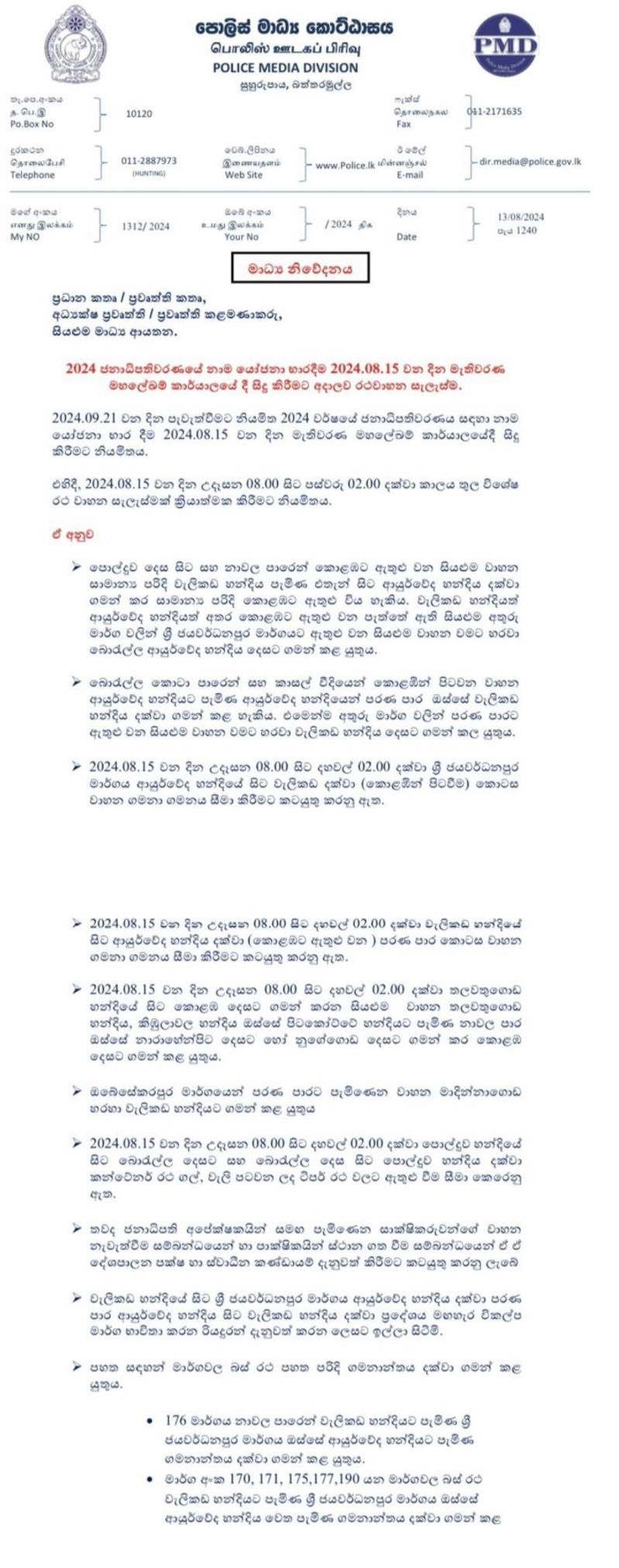 The Sri Lanka Police has announced that a special traffic plan will be implemented on Thursday in view of the acceptance of nominations at the National Election Commission for the upcoming presidential elections.