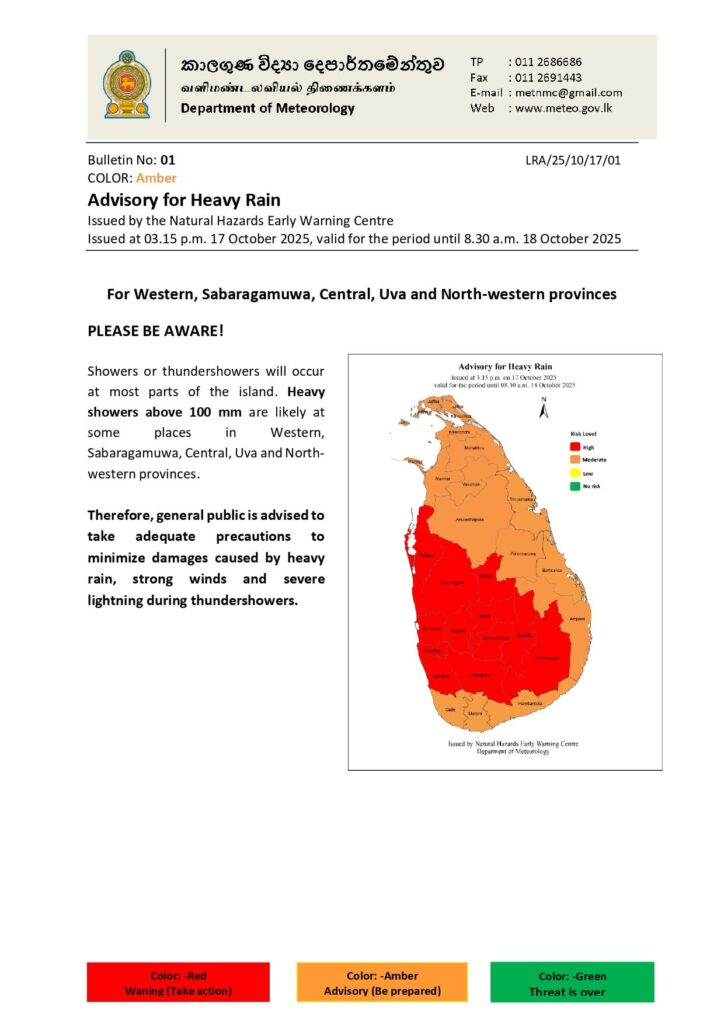 Showers or thundershowers will occur at most parts of the island. Heavy showers above 100 mm are likely at some places in Western, Sabaragamuwa, Central, Uva and North- western provinces.