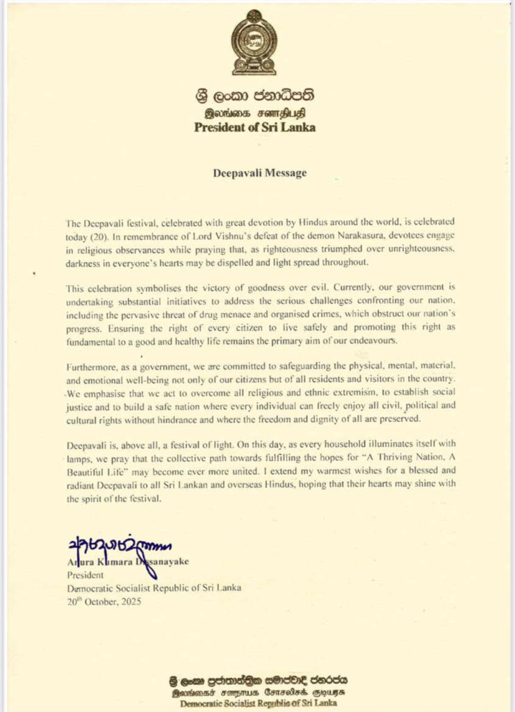 President Anura Kumara Dissanayake, in his message for the 2025 Deepavali Festival, says that the festival symbolises the triumph of righteousness and light over darkness, inspiring all to overcome challenges with unity and hope.