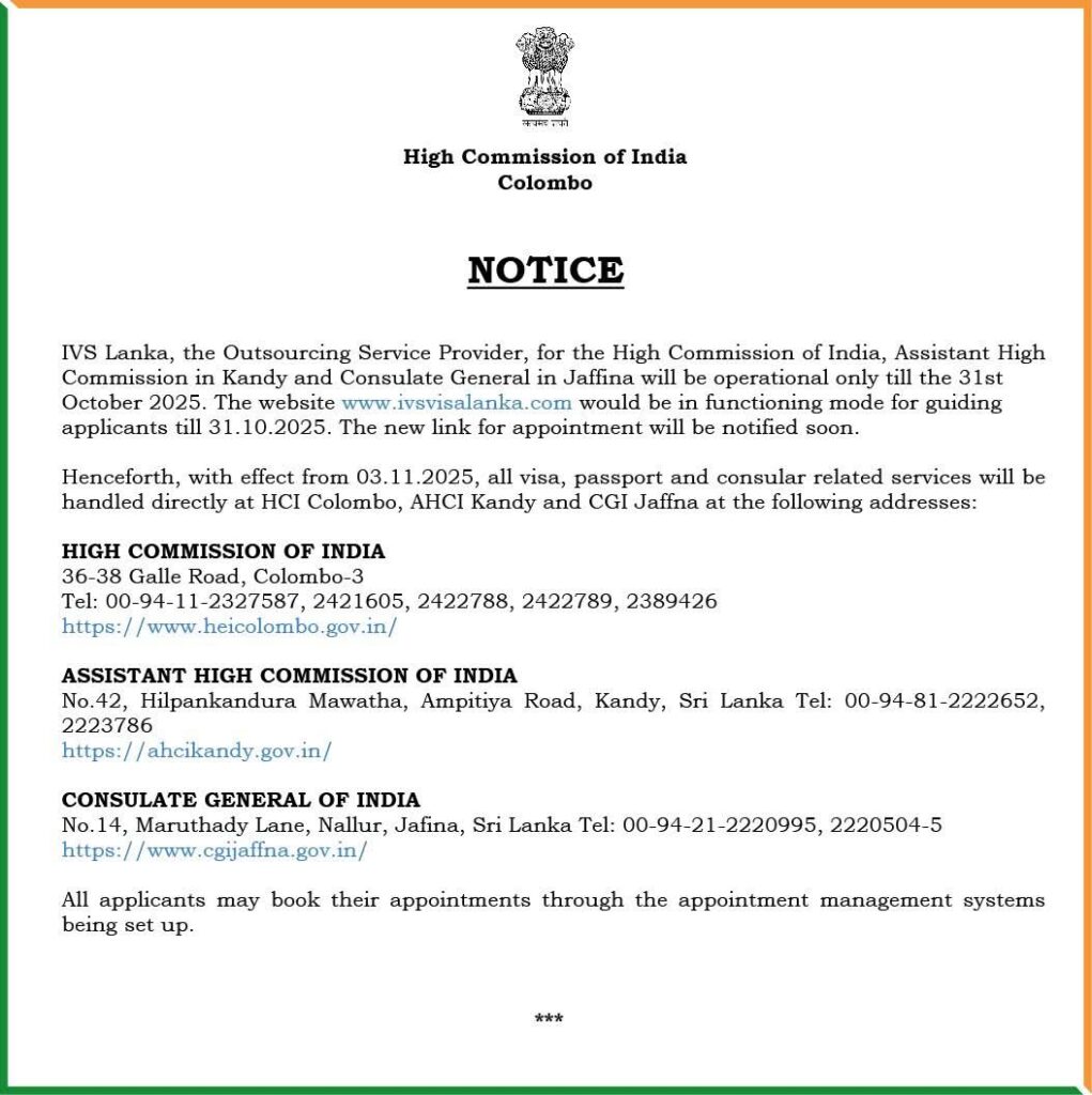 According to an official notice, starting November 3, 2025, all visa, passport, and consular-related services will be handled directly by the High Commission of India (Colombo), Assistant High Commission (Kandy), and Consulate General of India (Jaffna).