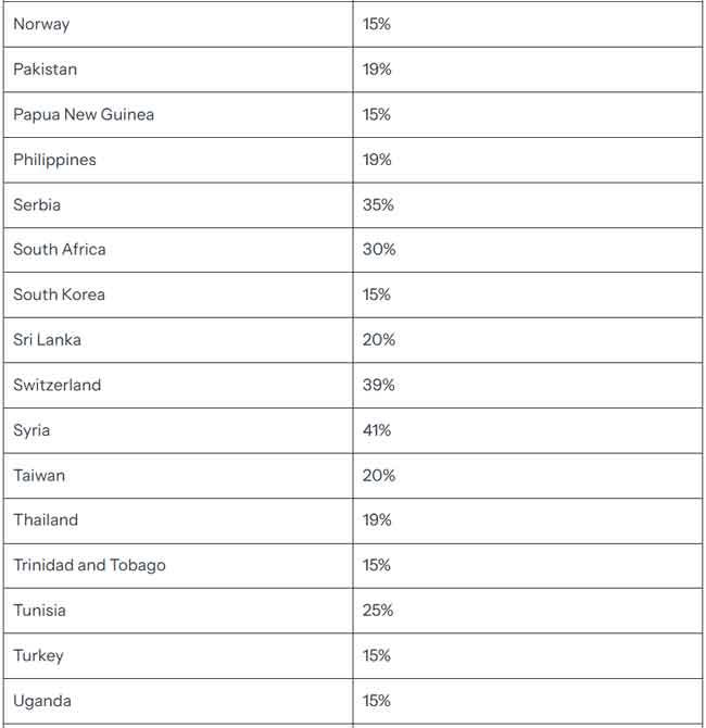 මෙම පහත දැමූ තීරුබදු අනුපාත අතර ඉහළම ප්රතිශතය 41%ක් වන අතර, එය සිරියාව වෙනුවෙන් දක්වා තිබේ.