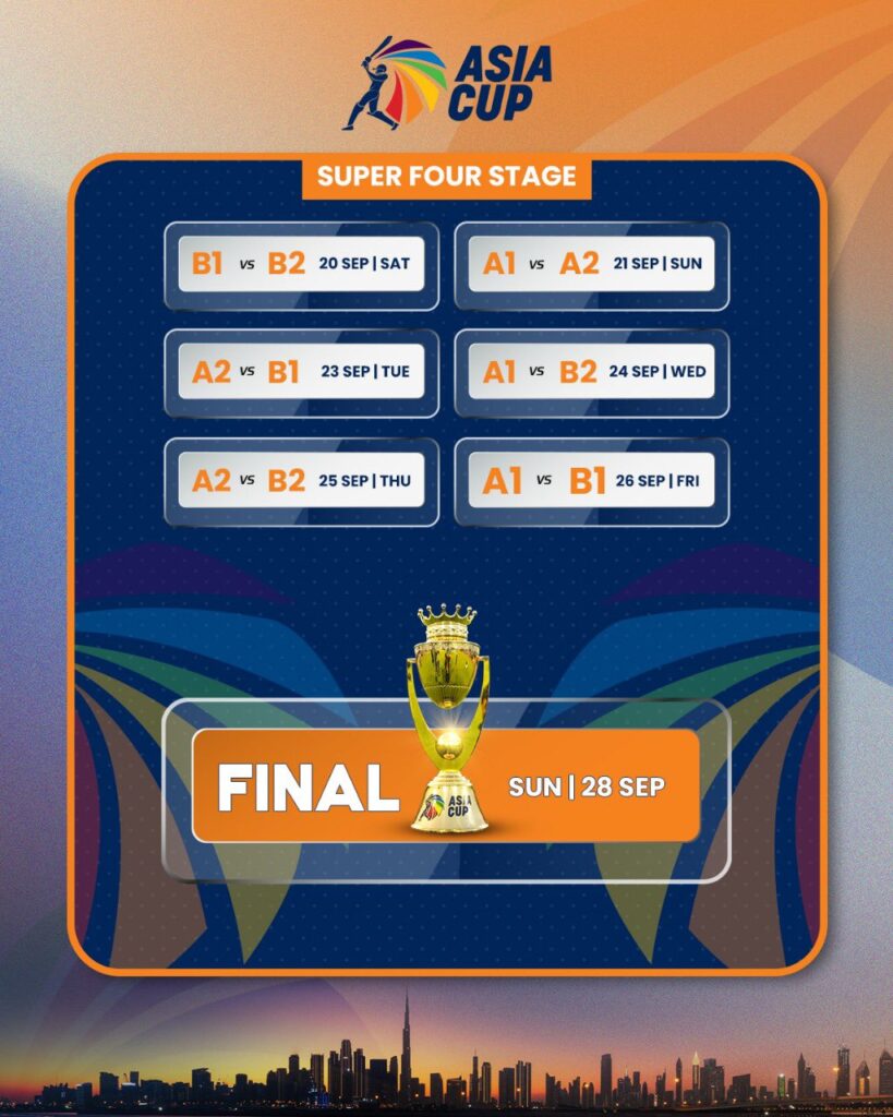 Two teams from each group will qualify for the Super Four stage. In the Super Fours, each team will face the other three once. Two teams from the Super Four stage will play the final.