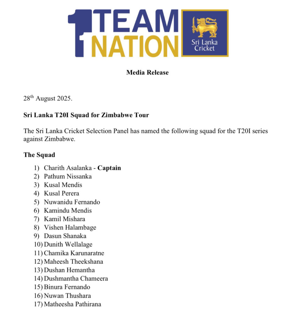 The Sri Lanka Cricket Selection Panel has named the following squad for the T20I series against Zimbabwe.