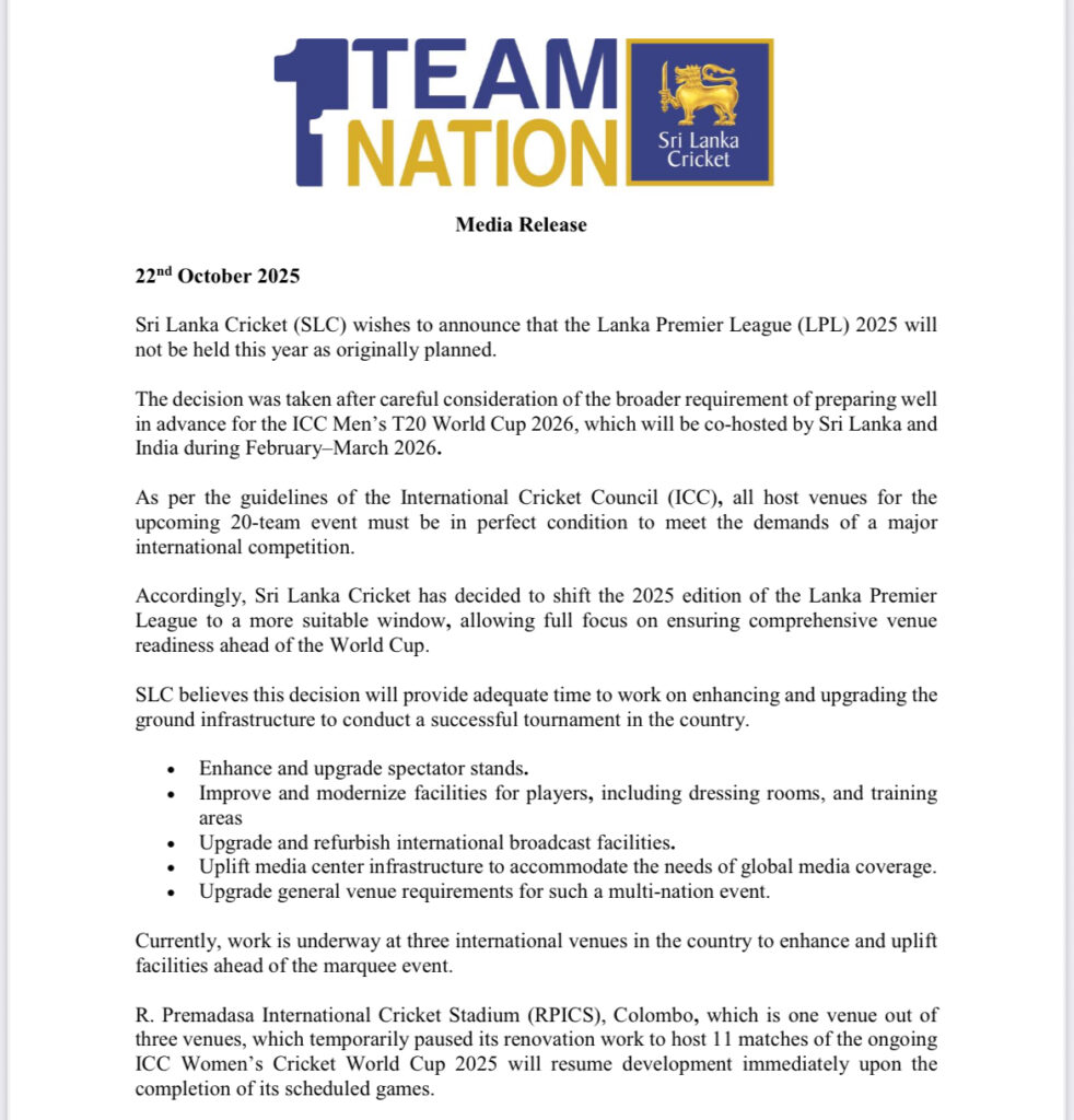 Sri Lanka Cricket (SLC) wishes to announce that the Lanka Premier League (LPL) 2025 will not be held this year as originally planned.