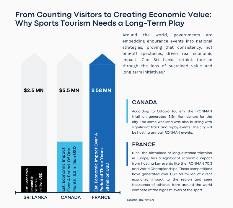 When Colombo hosted its inaugural IRONMAN 70.3 in 2018, all 880 slots sold out. This event drew 3,000 foreign visitors from 64 countries and generated over US$2 million in tourism revenue. Families stayed an average of five to seven days, exploring beaches, heritage cities, and wildlife parks. “These participants will take Colombo to the world,” said Yasas Hewage,  Sports Tourism Expert and Organiser of Race The Pearl and IRONMAN 70.3 Colombo. “Sports tourism can be a true thrust sector for Sri Lanka’s economy, drawing travellers to every corner of the island.”