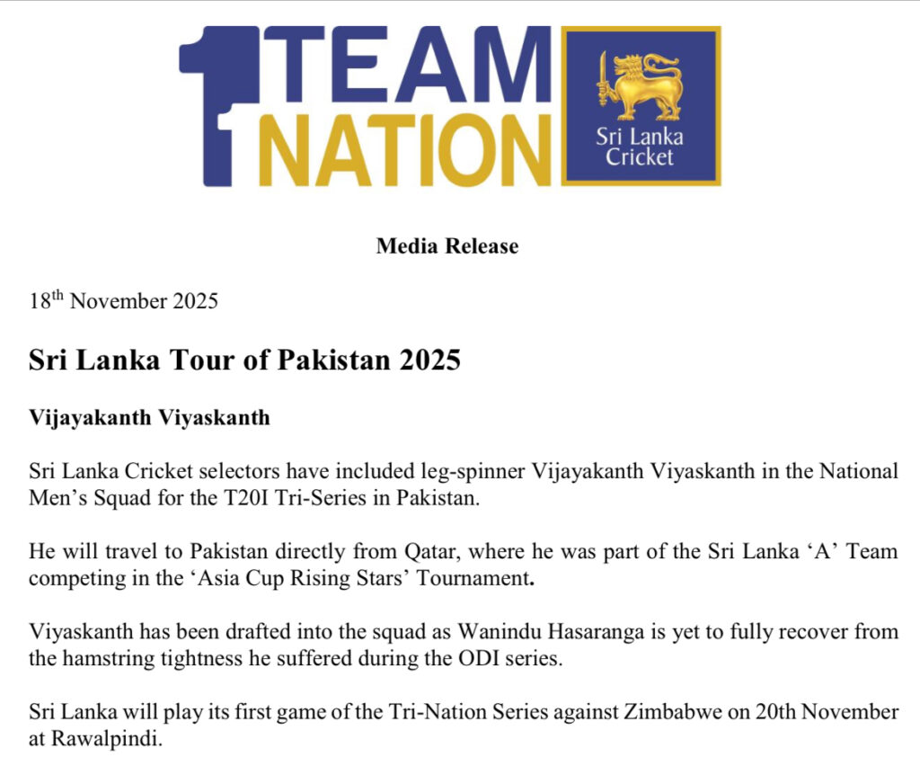 Viyaskanth has been drafted into the squad as Wanindu Hasaranga is yet to fully recover from the hamstring tightness he suffered during the ODI series.