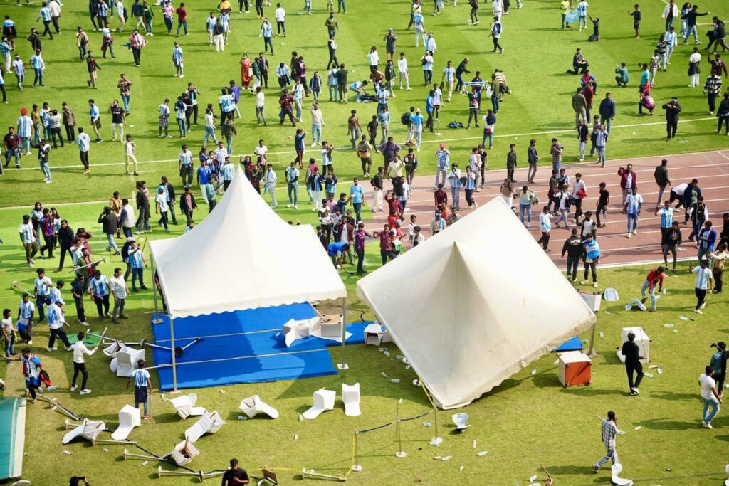 Lionel Messi reached Salt Lake Stadium along with his Inter Miami teammates Rodrigo De Paul and Luis Suarez. State sports officials, event organisers and police were also present. Trouble started when Messi walked around the field to greet fans. Problems began when Messi walked around the field to greet fans. The crowd pushed forward, making it hard for police to maintain the perimeter.