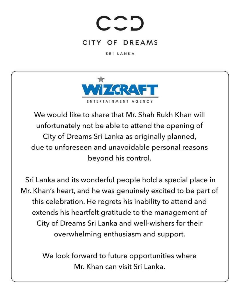 Bollywood superstar Shah Rukh Khan will not attend the grand opening of City of Dreams Sri Lanka, South Asia’s first integrated resort, due to “unforeseen and unavoidable personal reasons beyond his control,” his talent agency Wizcraft announced.